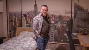Stef Nabben komt oorspronkelijk uit de buurt van Venray maar voelde zich meteen thuis in de Deurnese Droom. Trots laat hij zijn keurig opgeruimde appartement zien. Op zijn slaapkamer springt het fotobehang van New York meteen in het oog. “Dat heb ik zelf uitgezocht. Ik vind het mooi en ik wil er een keer heen.”