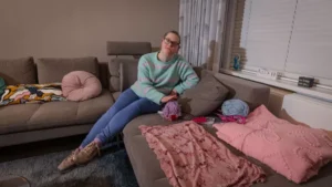In haar eigen woonkamer hangt ook zelfgemaakte kunst. Aniek ploft neer in de hoek van de bank. “Dit is mijn favoriete plekje. Hier zit ik vaak te naaien of breien.” Er ligt een roze gebreide deken die al af is. Nu is ze bezig met een grote, roze tas. Het is wel duidelijk wat haar lievelingskleur is.