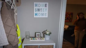 Aniek bijvoorbeeld is heel creatief en werkt bij ArtORO. “Ik heb samen met Eline een schilderij gemaakt speciaal vanwege ons tienjarige bestaan.” Trots toont ze de canvas panelen met huisjes erop en echte lampjes erin. Het kunstwerk krijgt rond 13 december, de officiële verjaardag van De Droom, een plekje in de gezamenlijke woonkamer.