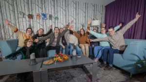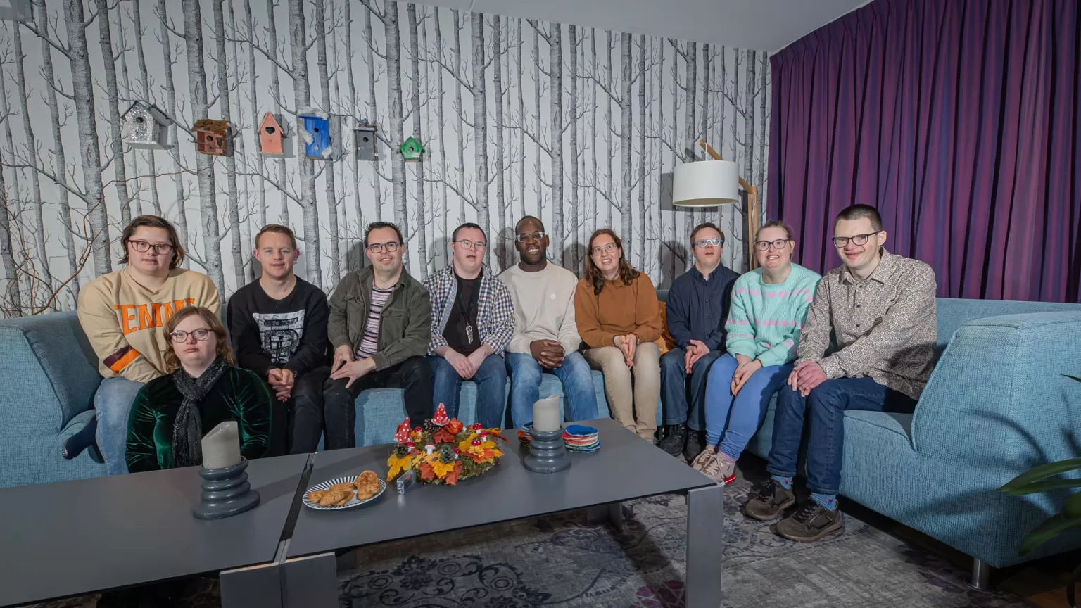 Na de rondleidingen door enkele appartementen hebben alle bewoners zich beneden op de enorme hoekbank verzameld. Ze willen maar wat graag een groepsfoto laten maken. De tien vrienden poseren schouder aan schouder. De fotograaf vraagt om een feeststemming en hup, het plaatje staat erop. Vrijdag 13 december vieren de bewoners samen met familieleden, begeleiders, vrijwilligers en sponsoren hun jubileum in De Wik.